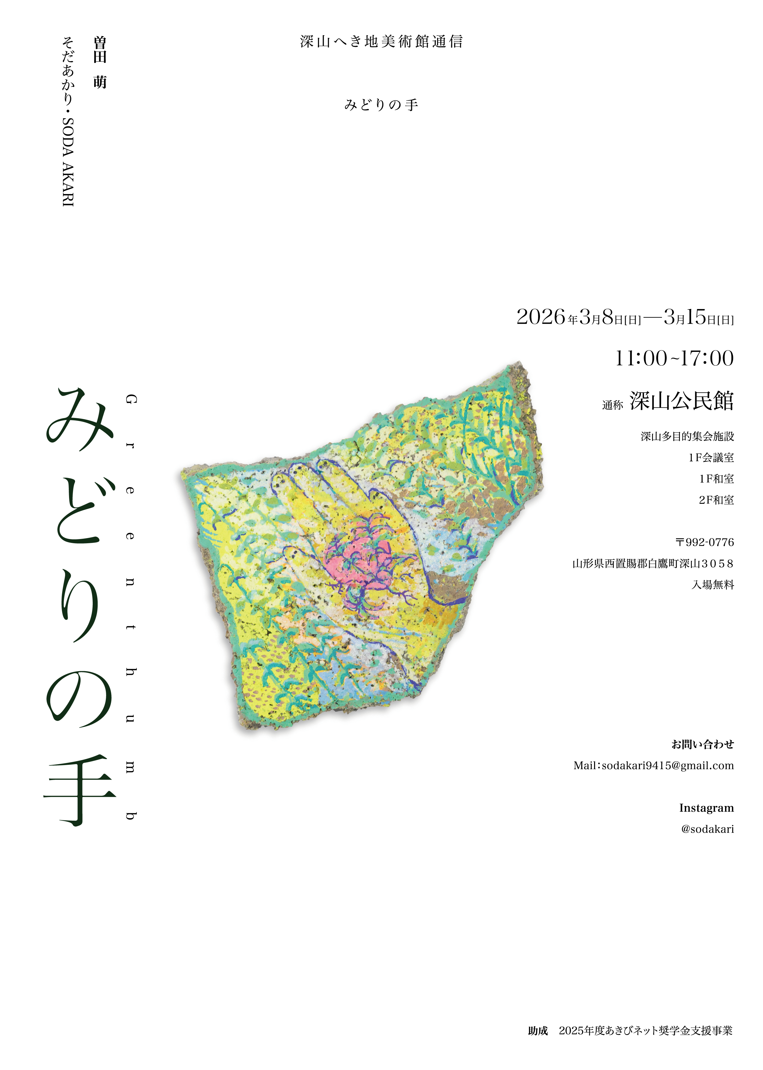 修士2年・曽田萌さんの個展「深山へき地美術館通信 みどりの手」を開催します
