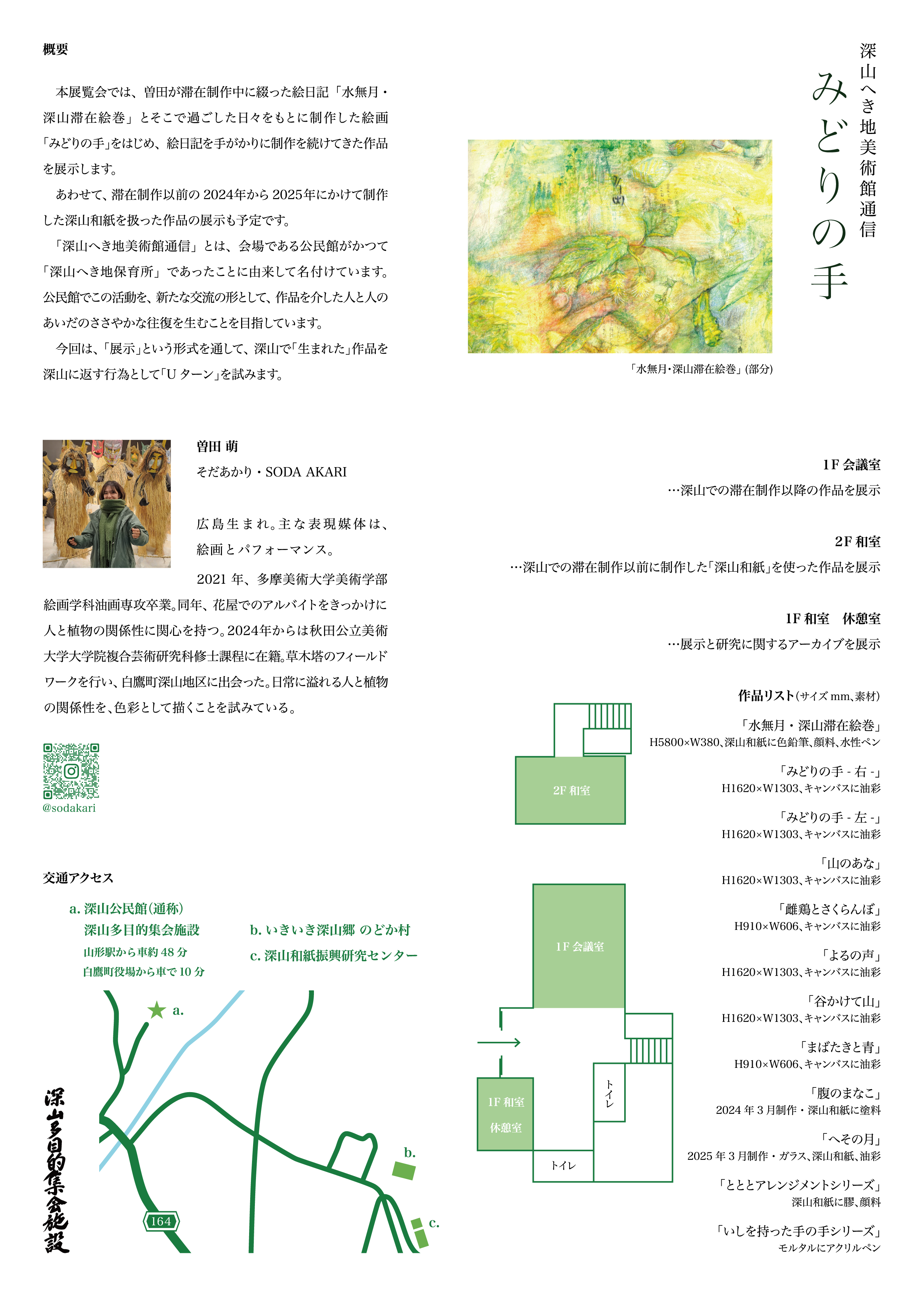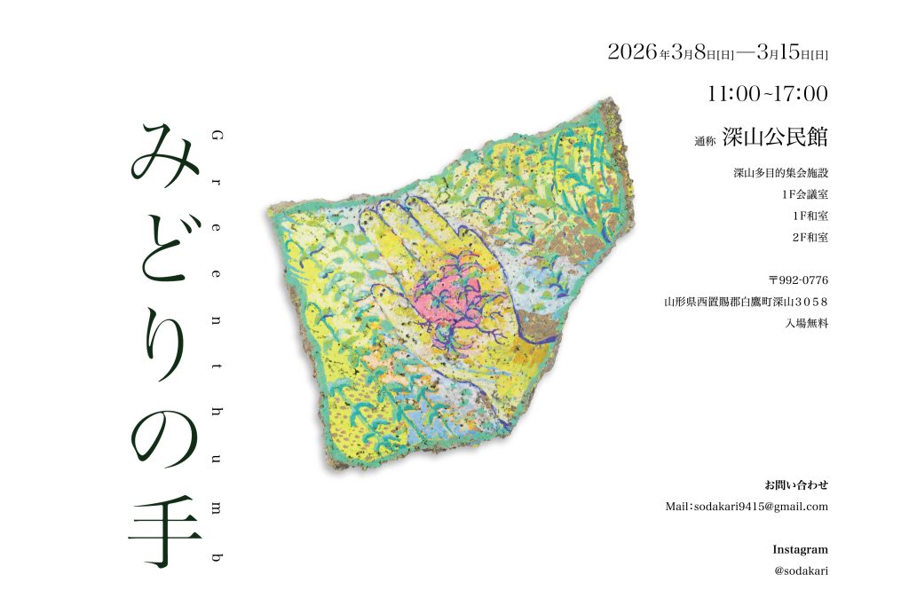 第3回目となる本展覧会は、深山地区の公民館がかつて「へき地保育所」であったことに由来し、「深山へき地美術館通信 みどりの手」と題しました。